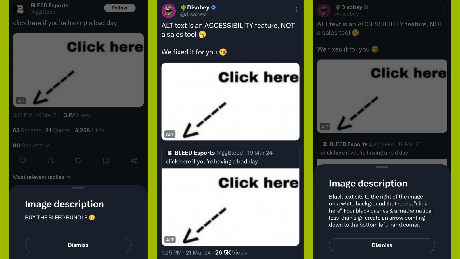 โ Donโt use Alt Text as a meme or for sales pitches: Alt Text is there to explain the image, not for you to make jokes at the expense of accessibility.
